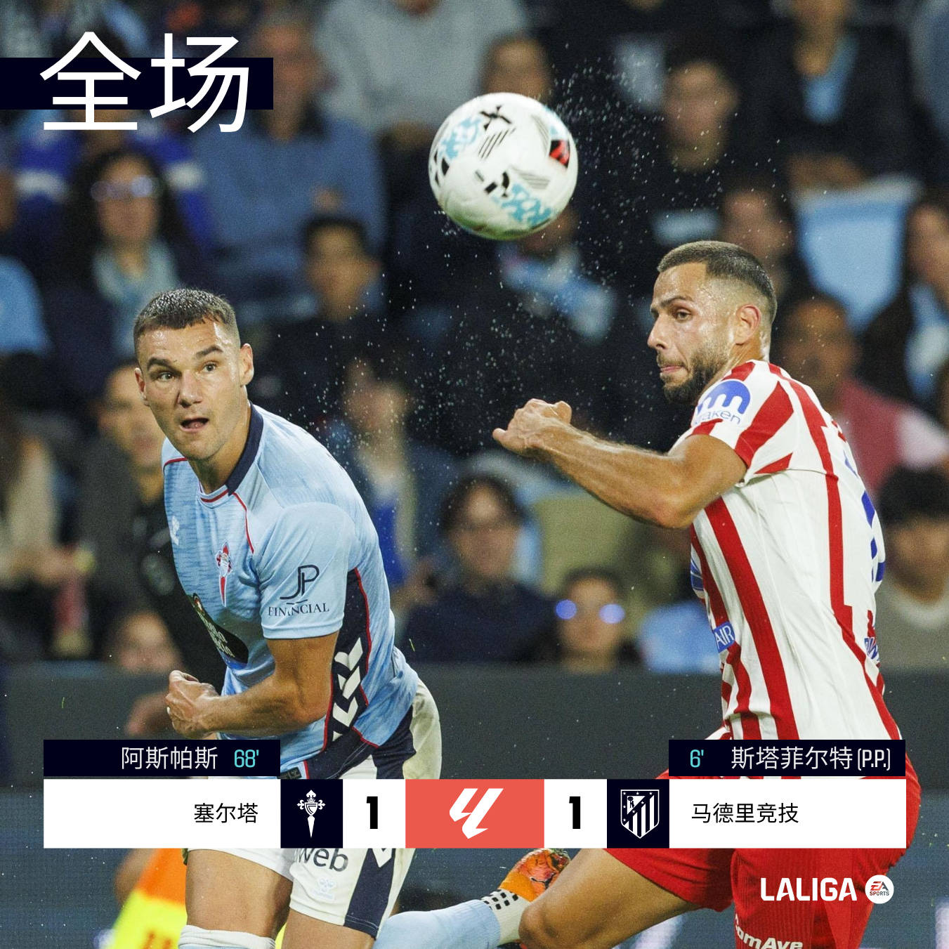 塞尔塔终于扳平比分!明格萨右路传中,伊格莱西亚斯射门被奥布拉克扑出,阿斯帕斯跟进补射破门,1-1!