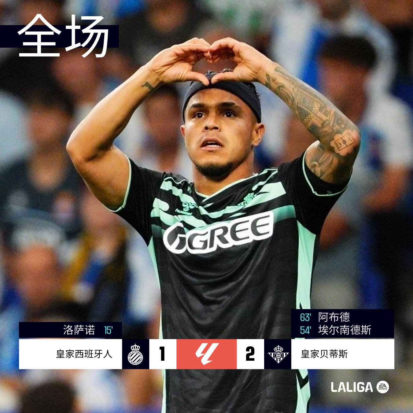 贝蒂斯完成反超!福纳尔斯在中场送出风骚外脚背直塞,穿透西班牙人整条防线,阿布德领球单刀推射破门,2-1!