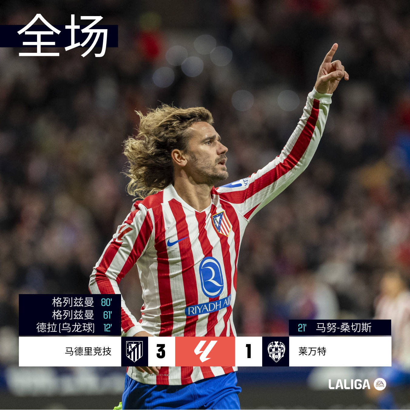 - 第61分钟和第80分钟:格列兹曼替补登场梅开二度,神锋归来。西蒙尼的换人起到了决定性作用:第61分钟,格列兹曼刚刚登场1分钟,便接到略伦特的横传,在门前推射破门,帮助马竞反超为2-1!仅仅19分钟后,马竞在前场断球,格列兹曼再次跟进补射再下一城,3-1!这位法国前锋仅用29分钟就完成梅开二度,帮助马竞豪取4连胜,积分升至25分,距离榜首的皇马仅差5分。