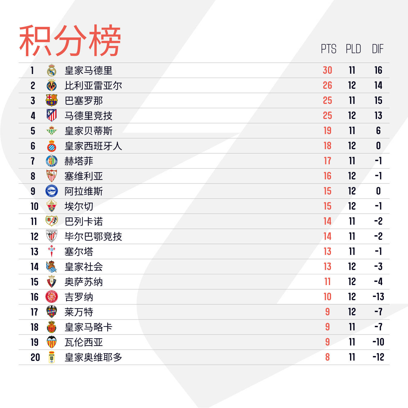 其他比赛的结果也引人注目:塞维利亚1-0小胜奥萨苏纳,赫罗纳1-0战胜阿拉维斯,皇家社会与埃尔切战成1-1平局。西甲最新的积分榜也随之更新。