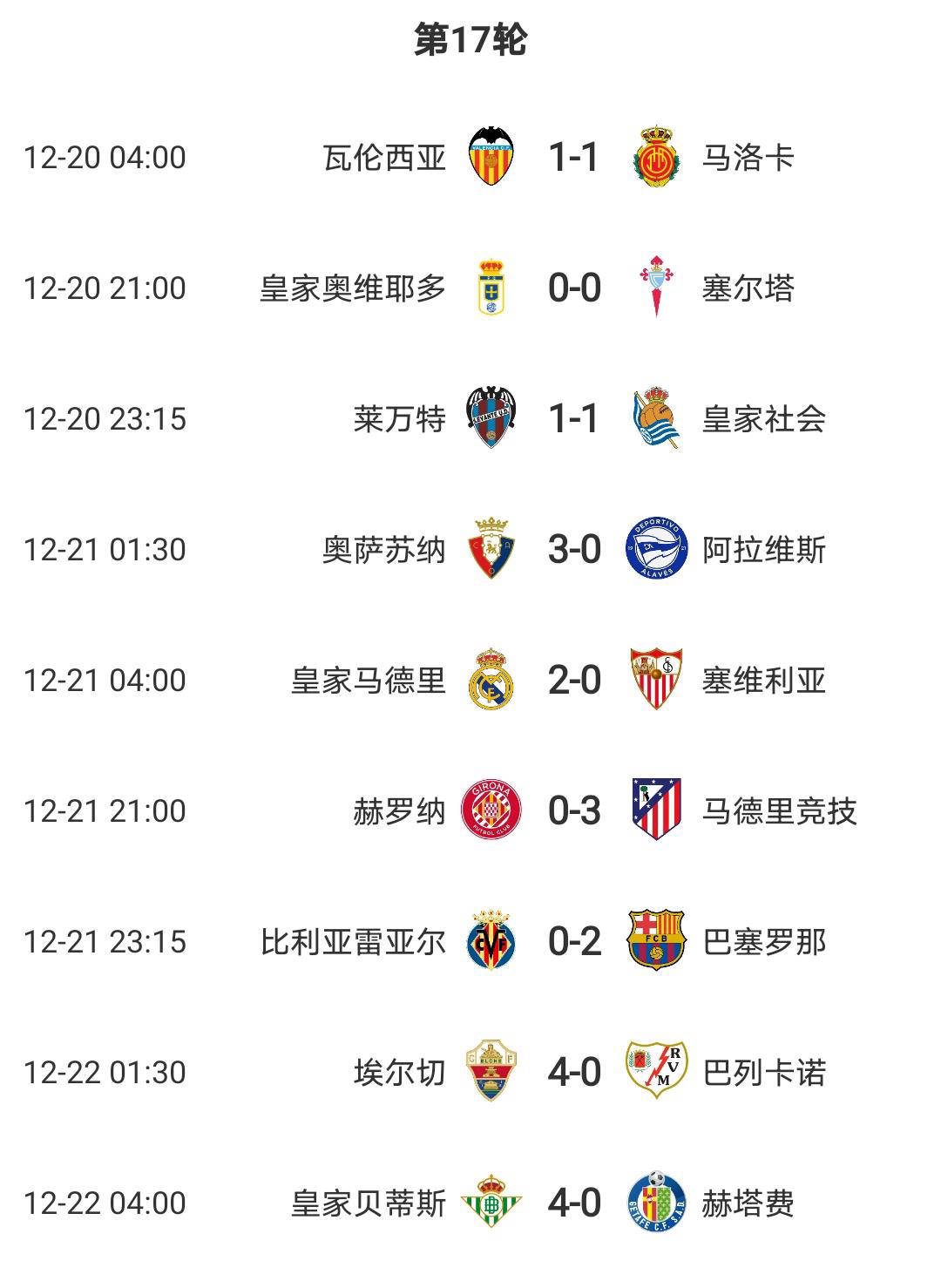 第17轮其他比赛同样精彩纷呈。皇家马德里和巴塞罗那双双以2-0收获胜利,鲍蒂斯和埃尔切上演了一边倒的比赛,分别以4-0大胜对手。此外,本轮还出现了三场平局,联赛竞争异常激烈。从积分榜整体格局来看,强队实力明显突出,而弱队则表现相对挣扎,形成鲜明的“强弱分化”。