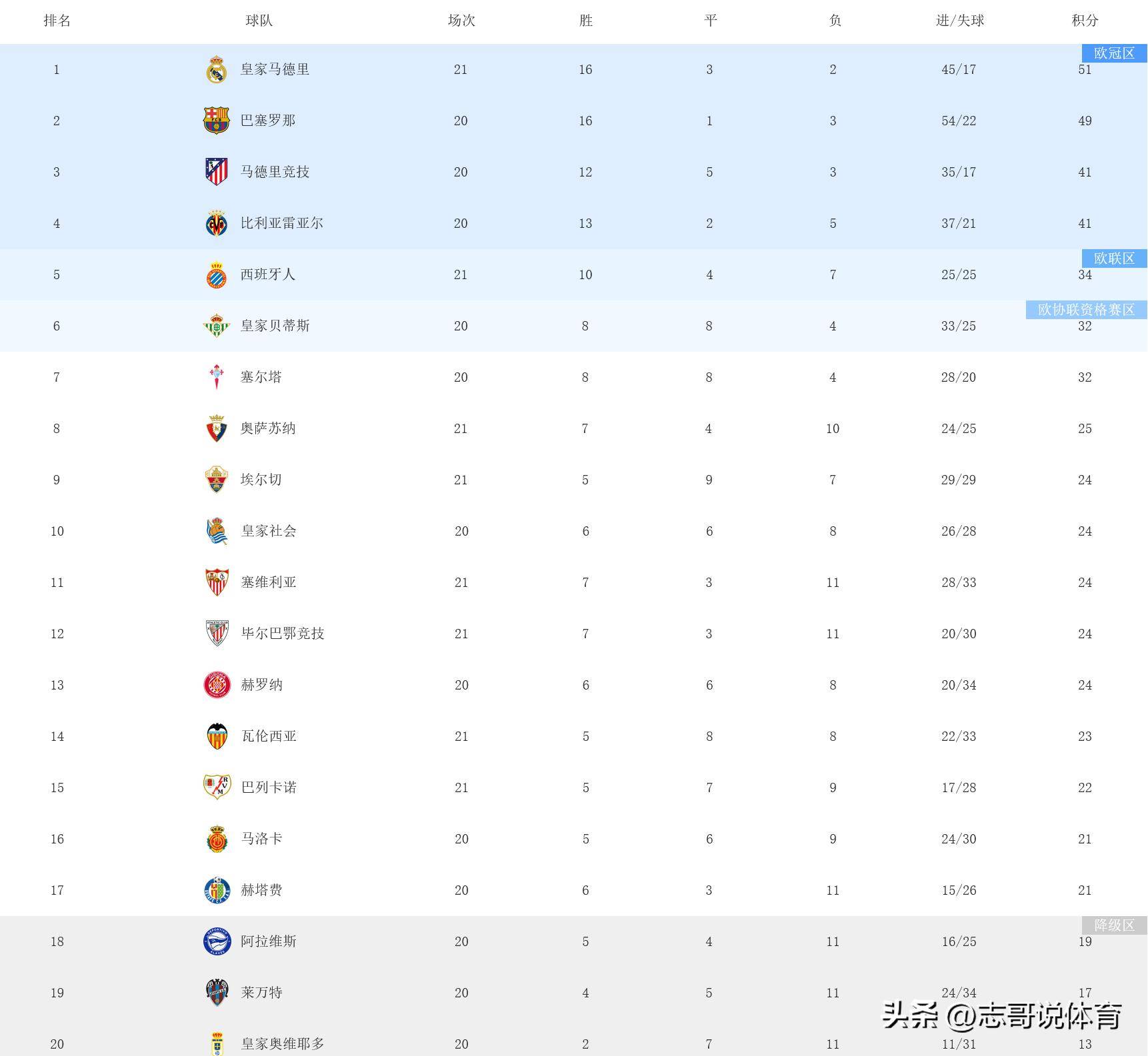本轮稍早结束的比赛,奥萨苏纳3-1击败了巴列卡诺、瓦伦西亚3-2力克西班牙人、塞维利亚2-1毕尔巴鄂竞技,莱万特3-2险胜埃尔切。