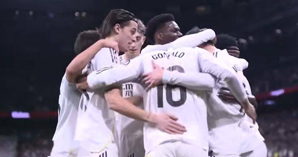 然而,正是这种逆境,激发出了球队更强的战斗力。 比赛仅仅开始第5分钟,皇马就取得了梦幻开局。 右后卫阿诺德送出一脚精准的斜线传中,禁区内的贡萨洛·加西亚机敏跑位,抢点推射破门,皇马1比0领先。 这个进球让伯纳乌球场瞬间沸腾,这是一个不能再完美的开局了。 领先优势保持了不到20分钟。