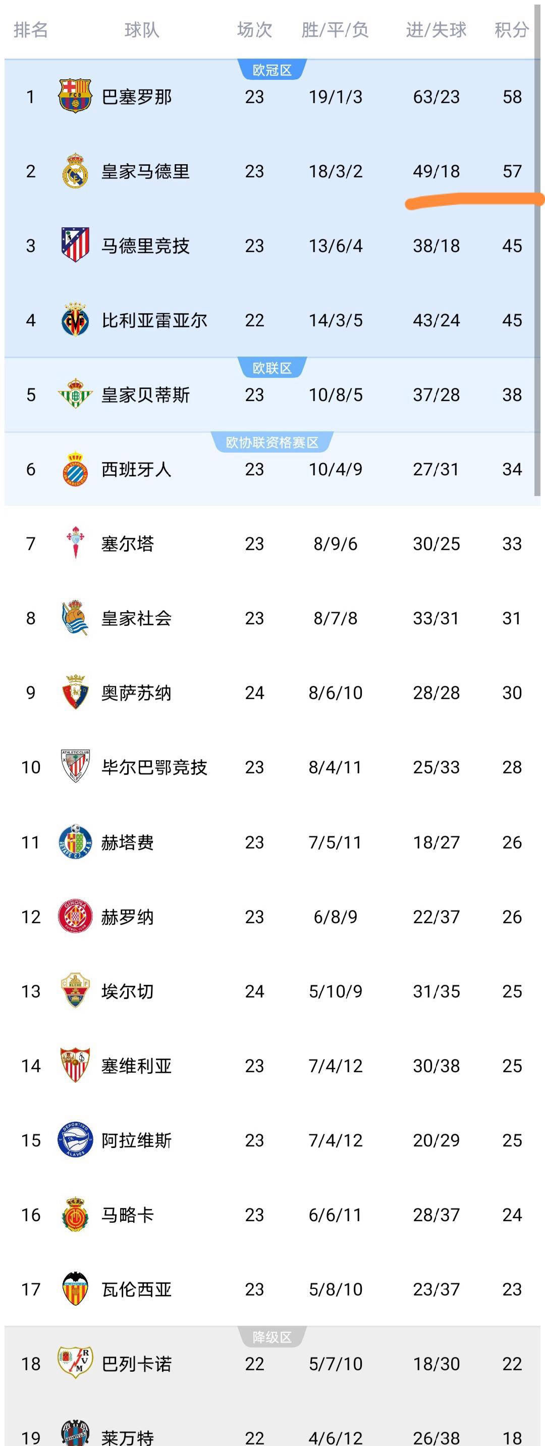 积分榜方面,前四名依旧由巴塞罗那、皇家马德里、马德里竞技以及比利亚雷亚尔占据。值得注意的是,巴萨与皇马之间的积分差距仅为1分,西甲冠军争夺进入白热化阶段,每一场比赛的胜负都可能影响最终排名。