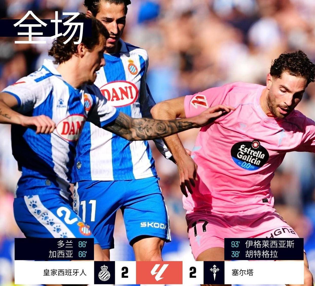 在另外两场比赛中,西班牙人与塞尔塔上演了进球大战。 塞尔塔由胡特格拉在第38分钟首开纪录,西班牙人则在下半场由替补奇兵基克·加西亚在第66分钟扳平比分。 第86分钟,多兰的进球帮助西班牙人一度反超,眼看胜利在望,但伤停补时阶段,塞尔塔前锋博尔哈·伊格莱西亚斯门前抢射得手,将最终比分定格为2-2。 西班牙人因此进入2026年后连续7轮联赛未能取胜。 与此同时,埃尔切与奥萨苏纳0-0互交白卷,比赛相对平淡。返回搜狐,查看更多