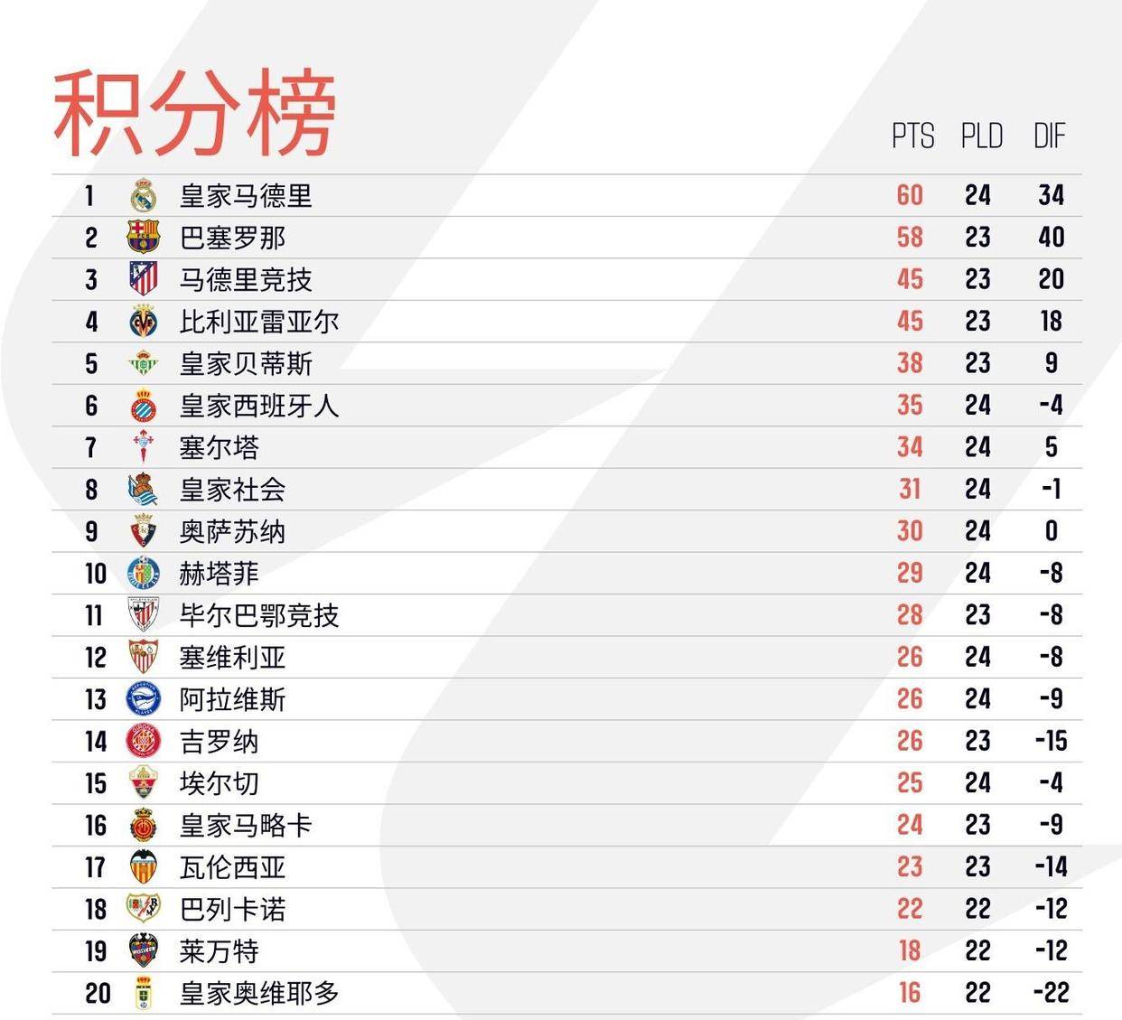 当皇马比赛结束的哨音吹响时,西甲积分榜的榜首位置发生了决定性的变化。 皇家马德里的积分从57分跃升至60分,战绩为24场19胜3平2负。 而巴塞罗那在少赛一轮的情况下,积分是58分。