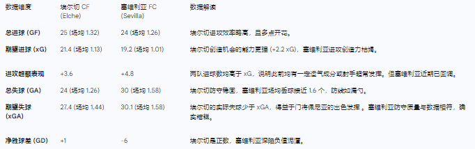 深入洞察:埃尔切的 xG 数据(21.4)虽然不算顶尖,但考虑到他们升班马的身份,能够在 19 轮比赛中创造出比塞维利亚(19.2)更多的高质量机会,足以证明萨拉比亚战术体系的优越性。塞维利亚的 xG 仅为 19.2,排名西甲倒数 ,这解释了他们为何频频被零封——并非射术不精,而是根本无法将球送入危险区域。