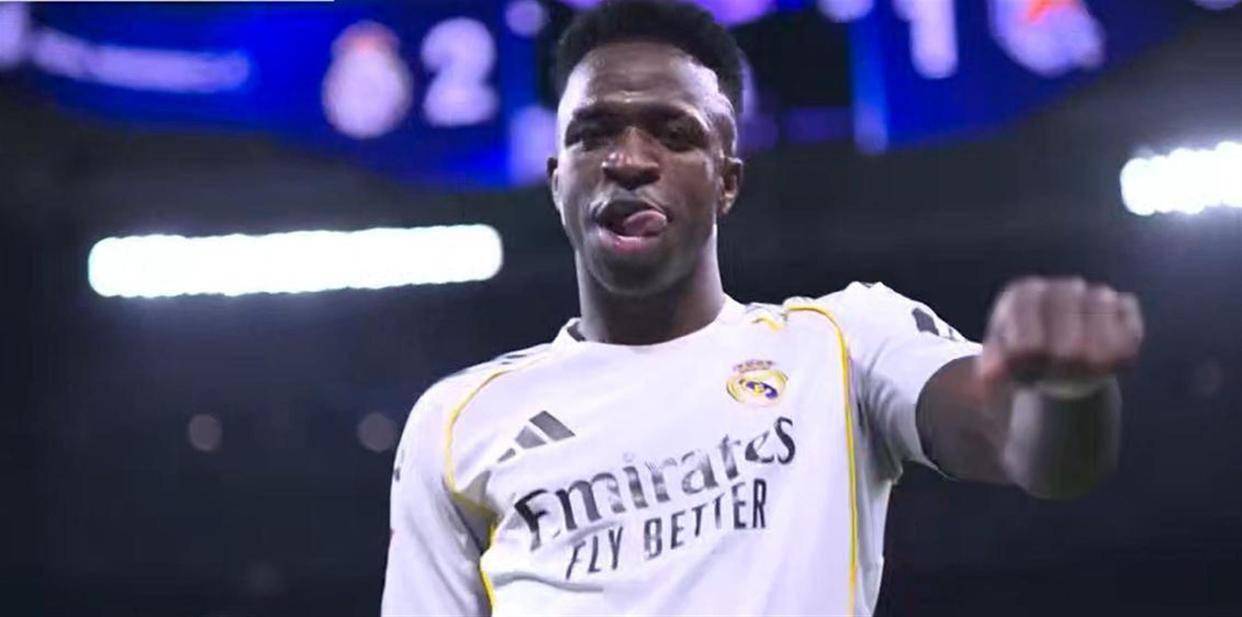 下半场易边再战,皇马没有收手的意思。 第48分钟,维尼修斯再次成为球场上的焦点。 他在左路面对阿兰布鲁的防守,用一个灵巧的穿裆过人将其突破,杀入禁区。 恼羞成怒的阿兰布鲁从身后将其铲倒,主裁判第三次判罚点球。 维尼修斯再次站上点球点,他依然采用跳步主罚的方式,又一次骗过了门将雷米罗,将球稳稳罚进。 4比1,维尼修斯完成梅开二度,也彻底杀死了比赛悬念。
