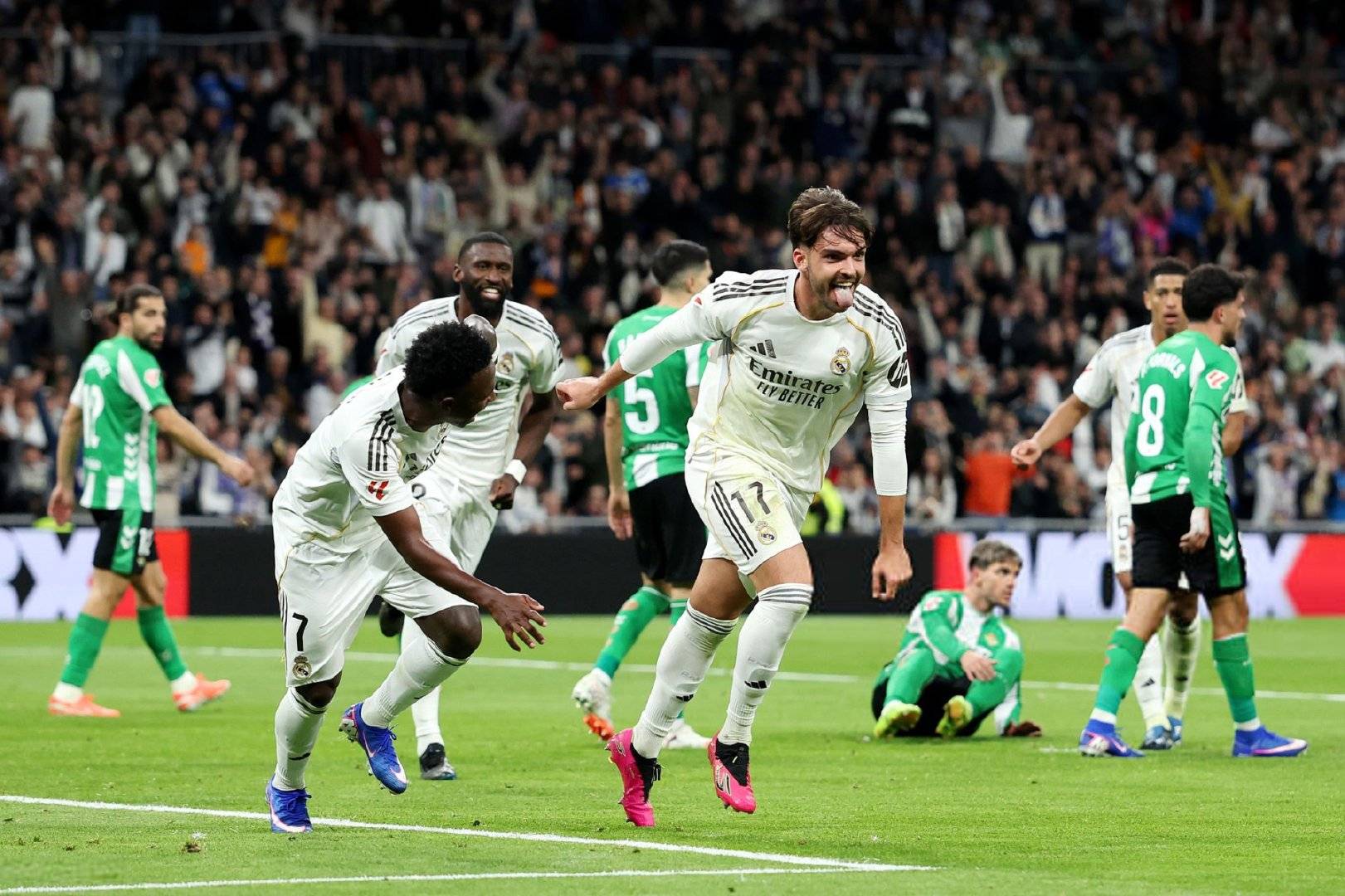 本轮的另一场焦点战,皇马5-1大胜皇家贝蒂斯。如此结果或许有点出乎意料,因为姆巴佩的伤缺,赛前外界并不看好皇马,但实际表现却让人相当惊喜,21岁的贡萨洛·加西亚久违受到重用,上半场先是一记头球为队伍首开纪录,这还仅仅是开始,下半场才真正成为他表演的舞台,凌空世界波+禁区的神龙摆尾式进球,上演帽子戏法闪耀伯纳乌,不负众望成为胜利的最大功臣。