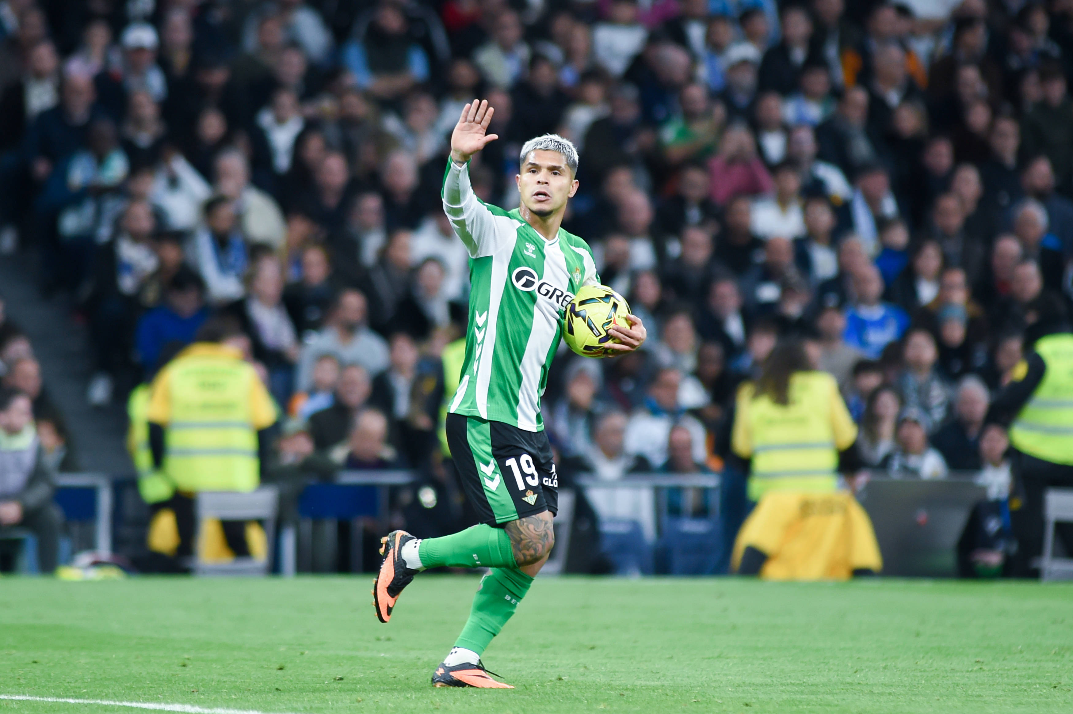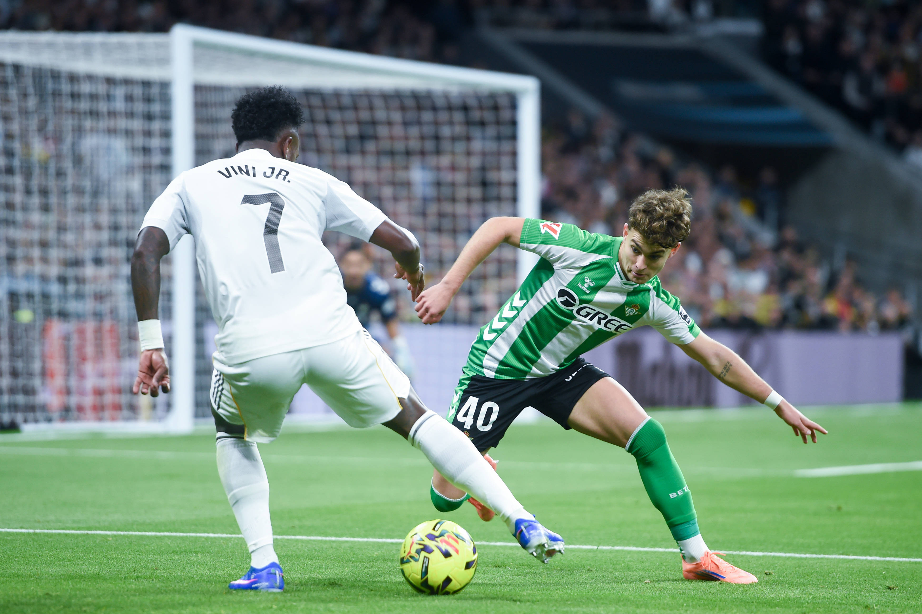 1月4日,皇家马德里队球员维尼修斯(左)和皇家贝蒂斯队球员安赫尔·奥尔帝斯拼抢。 新华社发(古斯塔沃·巴连特摄)