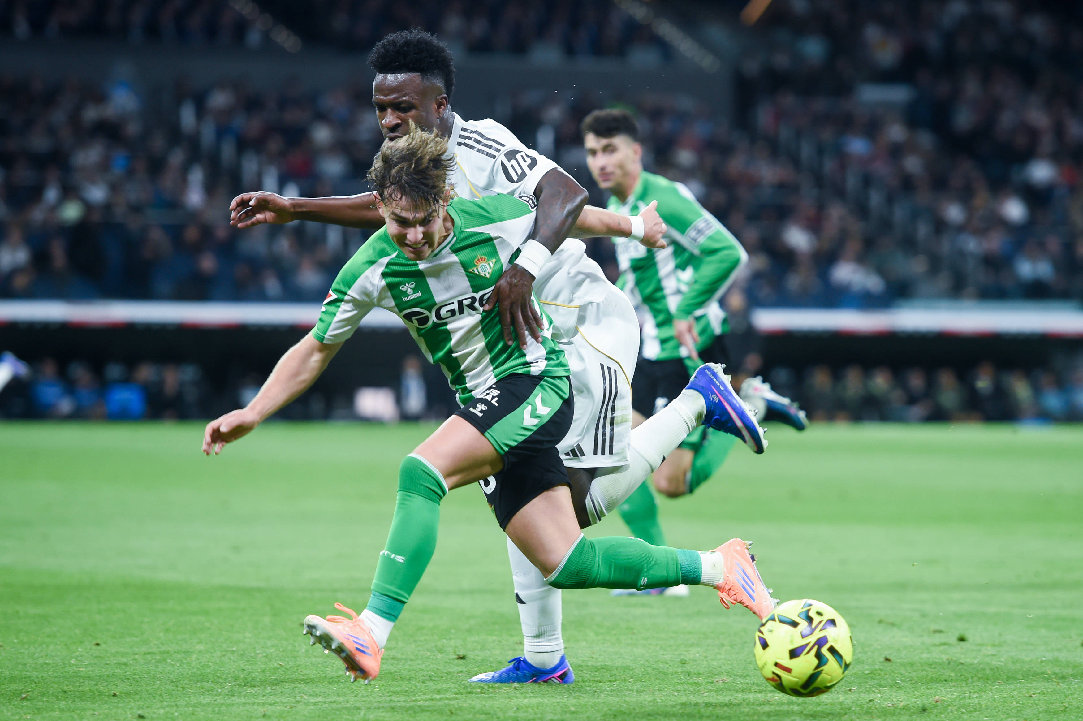 1月4日,皇家马德里队球员维尼修斯(前右)和皇家贝蒂斯队球员安赫尔·奥尔帝斯拼抢。 新华社发(古斯塔沃·巴连特摄)