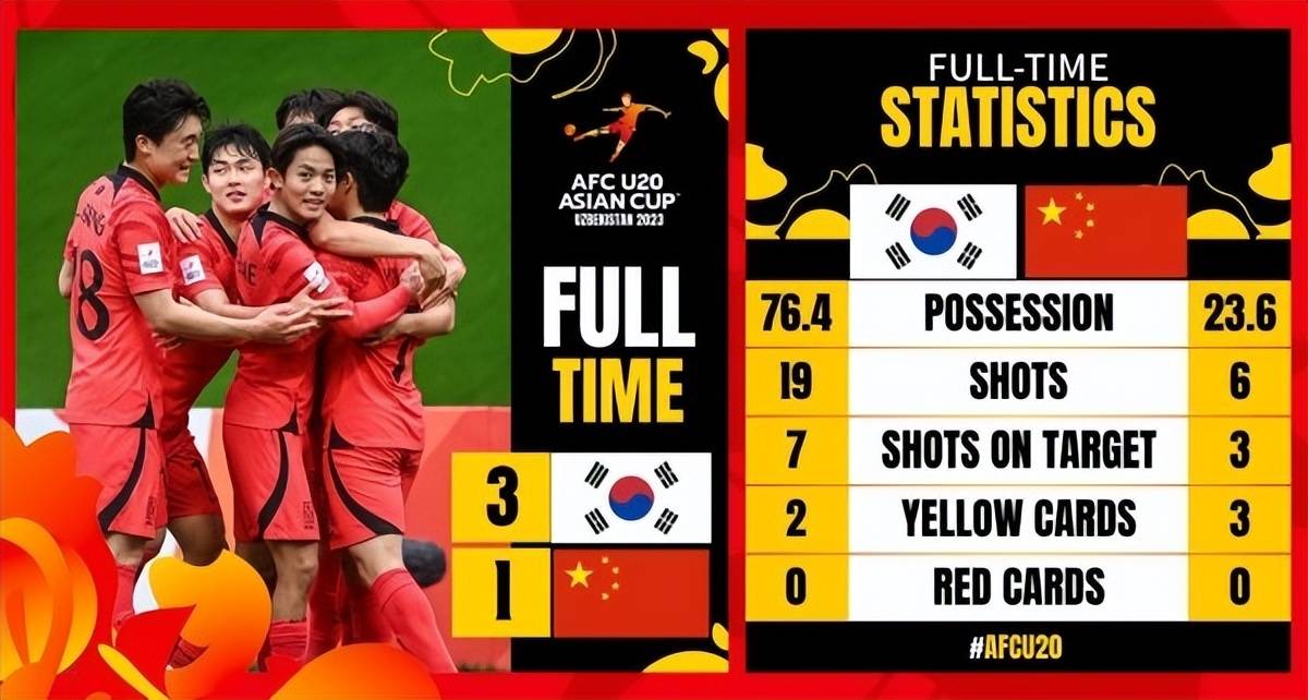 淘汰赛遇到韩国队,U20国青也是先拔头筹,可惜没能守住领先优势,在加时赛中被对方连入2球,被淘汰出局。