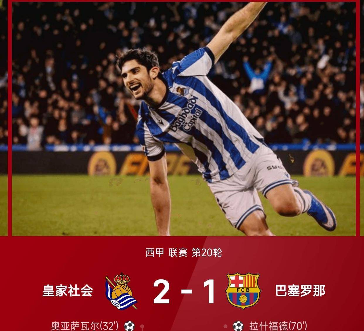 但比分牌不会因为争议而改变。 皇家社会的主场阿诺埃塔球场终场哨响时变成了欢乐的海洋,他们2比1拿下了卫冕冠军。