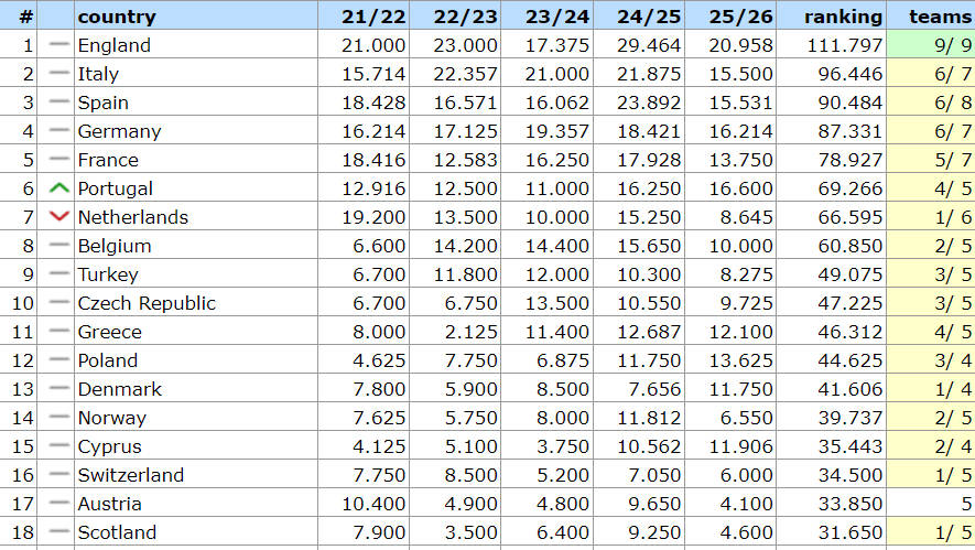当前欧足联五年积分排名显示,英超以平均20.958分稳居榜首,葡萄牙超级联赛以16.6分位列次席,德甲紧随其后,获得16.214分;而西甲仅积15.531分屈居第四,比意甲的15.5分稍高但形势并不乐观。法甲则以13.75分位列第六。若西甲不能及时改善成绩,反被意甲、葡超甚至法甲赶超,将意味着其能够派出的欧冠队伍将减少,由现有的4支锐减至3支。