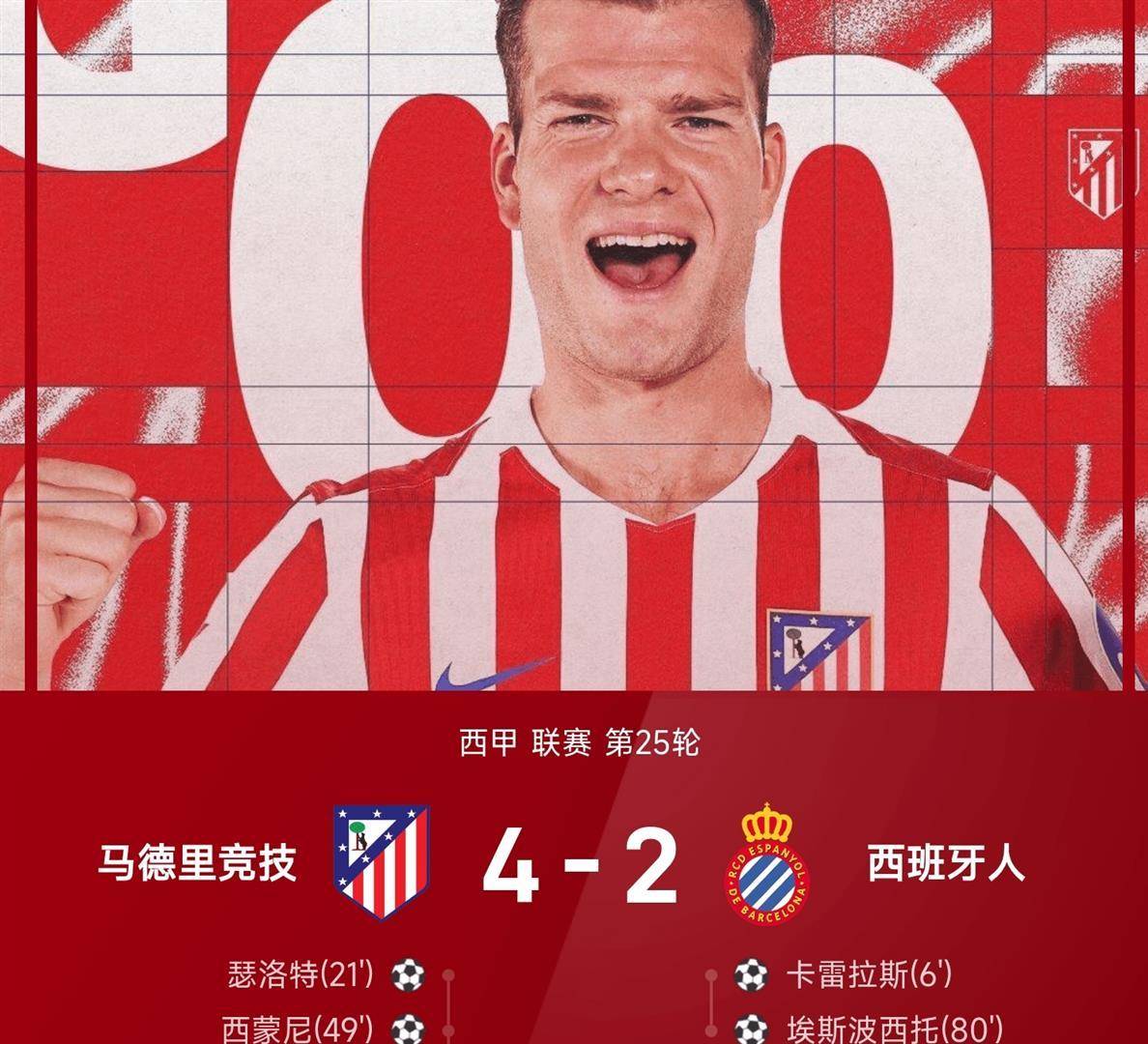 马竞的进球表演还没有结束。 第71分钟,左后卫鲁杰里再次在边路制造威胁,他突破后送出精准传中,瑟洛特在禁区内高高跃起,力压防守球员,一记势大力沉的头球攻门,皮球击中左侧立柱内侧弹入网窝。 4比1,瑟洛特完成了本场比赛的梅开二度,也彻底杀死了比赛悬念。 尽管西班牙人在第80分钟由替补登场的埃杜·埃斯波西托在禁区外远射扳回一城,但已无关大局。 最终比分定格在4比2,马竞主场全取三分,结束了联赛三轮不胜的尴尬局面。